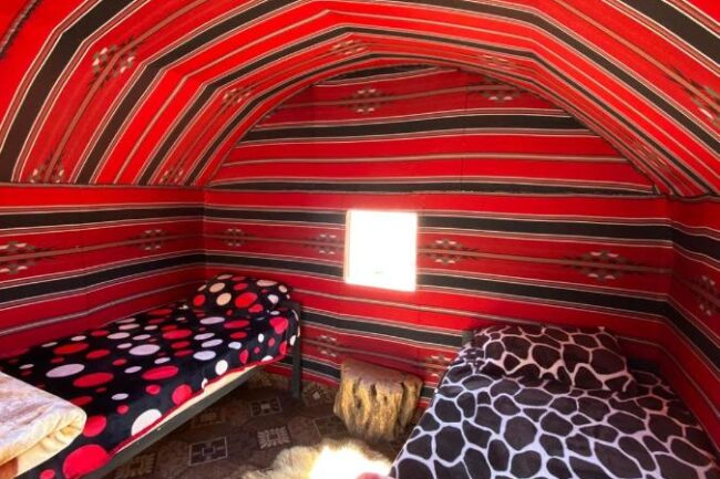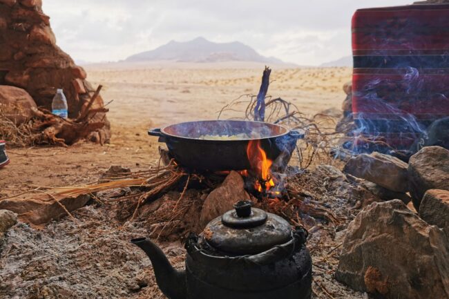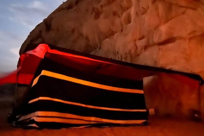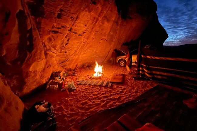 Après votre excursion d’une journée, nous nous dirigerons vers une « grotte ». La grotte est plutôt un rocher en surplomb qui nous protège du soleil, de la pluie et du vent. En plus de notre propre «grotte», nous avons quelques autres endroits où nous pouvons nous installer pour dormir à la belle étoile. L’endroit dépend de votre programme de visite, et, en haute saison, des disponibilités. Une fois arrivés à la «grotte», nous vous préparons un dîner bédouin traditionnel. Ensuite, vous pourrez passer la soirée autour du feu. Nous pouvons vous parler de la culture et de la musique bédouines ou vous pouvez contempler le ciel étoilé et profiter du silence paisible du désert.